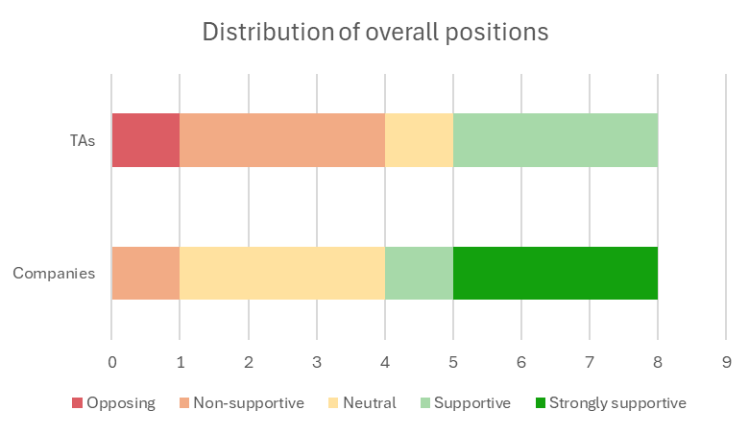 As shown in Figure 1, apparel trade associations tended to take more negative positions than those of individual companies. However, the division between company and trade association positions in the apparel sector is smaller than in many other sectors analysed by SLM, where trade associations often showed stronger opposition. This is partly due to some apparel trade associations, such as the Ethical Trading Initiative, Fair Wear Foundation, and Policy Hub Circularity for Apparel and Footwear (Policy Hub), taking more progressive positions and demonstrating their support for the CSDDD.